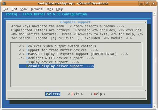 Now, deselect all the options in Graphics support by highlighting the option and pressing the N key. (The Backlight and LCD Driver support cannot be disabled, but all other options can be, as shown in Figure 4.)