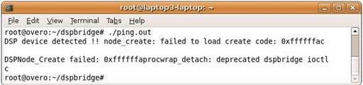 Once the new kernel has completed the boot sequence, add a password to the root user and secure copy the contents of the target/ directory of the userspace DSPBridge directories to the Gumstix. (The directories should be dspbridge/ and lib/.) Next, recursively copy the contents of the lib/ directory to the root /lib/ directory of the Gumstix and reboot the Gumstix. After the Gumstix reboots, enter the dspbridge/ directory and issue the ./ping.out command to receive the error shown in Figure 5.