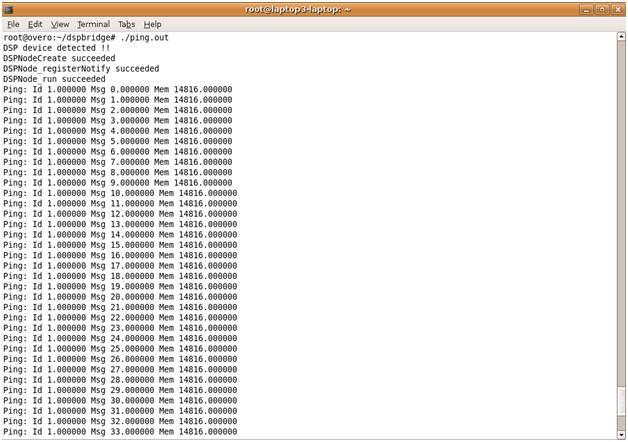 Next, register the base image with ./dynreg.out -r <sample>dyn_3430.dll64P for the test you want to run. For example, register the ping sample DSP program using the ./dynreg.out -r pingdyn_3430.dll64P command, and execute it with ./ping.out. The output should look like Figure 6.
