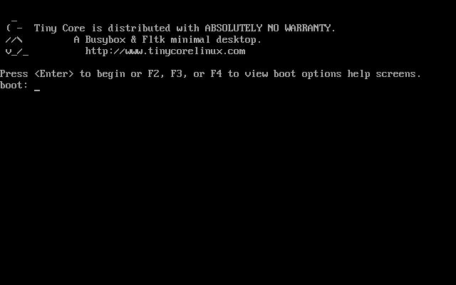 When you boot Tiny Core, you initially are dumped at a boot prompt (Figure 3). If you don't do anything, it times out and places you on the desktop. However, you can use boot codes, which have the form of tinycore option1 option2 .... Some of these boot codes include: