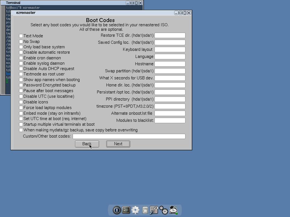 This kind of task happens often enough that the Tiny Core team has put together a GUI application that helps simplify these steps called ezremaster. Install it using the AppBrowser. This way, all the required dependencies also will be installed. You also need either to have the ISO available or a CD mounted. Once you've done all of these steps, open up a terminal and run ezremaster from the command line, and you should see what's shown in Figure 5. Here you can point it to the locations it needs, and you should end up with what's shown in Figure 6. From there, you can set all kinds of options to customize your ISO image. The sections available are: