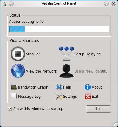 Now, with the Browser Bundle running, first the Vidalia control panel will start, which is designed to establish a Tor connection as well as manage various Tor options using a GUI front end. I recommend exploring the Vidalia control panel, as it has neat features, such as bandwidth monitoring, network viewer, settings dialog and more.