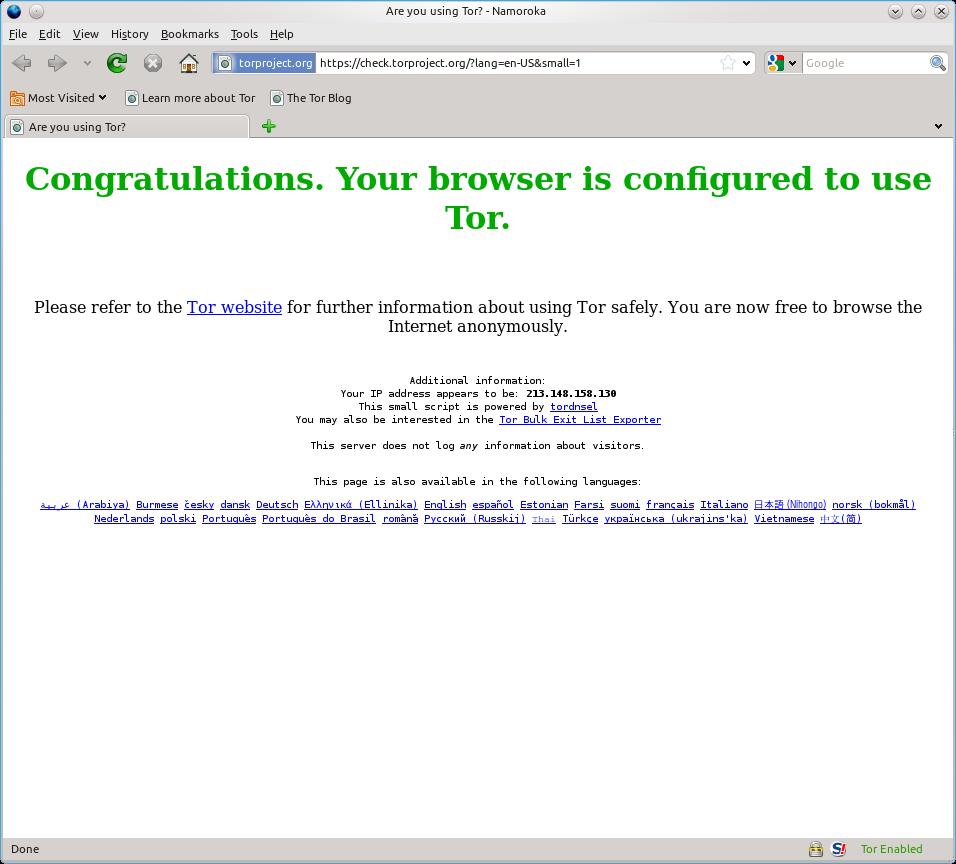 Provided all has gone well, Firefox should start and will try to load a Web page. This Web page takes a while to load—don't worry; the Tor network is pretty slow at the best of times, and if everything worked, you'll soon have a message that says in big green letters: “Congratulations. Your browser is configured to use Tor.”
