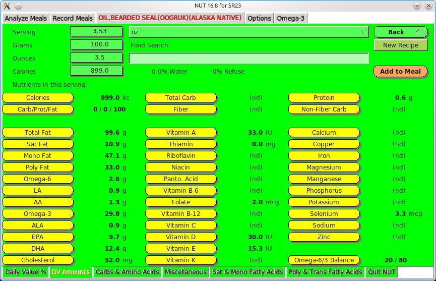 The NUT GUI makes using this program much less tiresome and displays other forms of information simultaneously. Here's the stats for bearded seal oil.