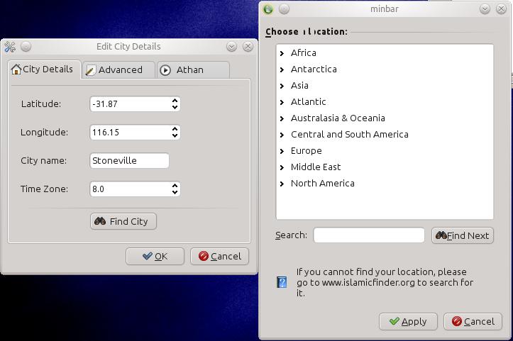 As the man page states, you first have to configure your location, time zone and Madhhab details. Click on Preferences, and you'll be presented with your city details. Here you define your latitude, longitude, city name and time zone. If you live in a major city, click on Find City, and there's a good chance your city will be on the list, so you won't need to enter these details manually.
