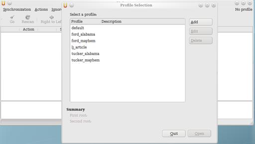 Although it is possible to run Unison by supplying arguments to the program on the command line, there is a better way—that is, to create a profile file for each root pair that is synced. These are *.prf files stored in the ~/.unison directory. When you start Unison in text mode, you can supply it a some_name argument that maps to a some_name.prf file. In GUI mode, Unison searches the ~/.unison directory for *.prf files and presents them as choices (Figure 1). For this article, I am using lj_article.prf (Listing 1).