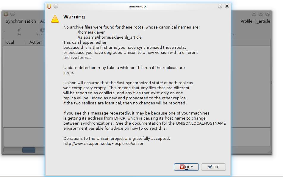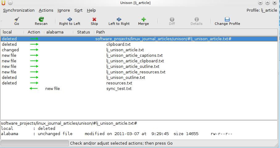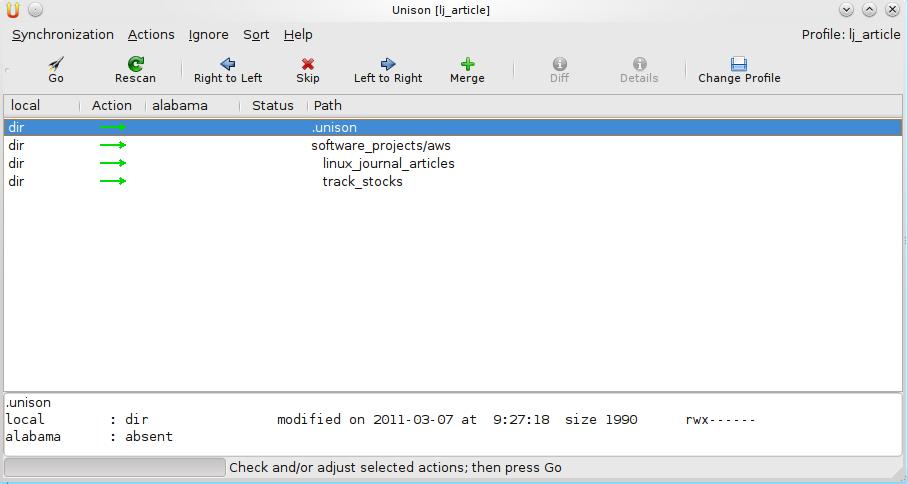 At this point, running this profile is anti-climatic. The first run pops up a warning about there not being archive files present for the root pair (Figure 2). The archive files are where Unison stores its information about the roots and files synced. Pressing Enter starts the process of the initial scan and the population of the archive files. After the scan is done, the GUI presents the choices available for file transfers (Figure 3). In this case, because the remote path is empty, all arrows point from local to alabama. There are two options here: arrow down through each choice and press Enter, or type the letter g as a shortcut for the Go button and start the transfer of all the files at once. On subsequent transfers, the choices for each directory/file may well be different, depending on the changes made on each root (Figure 4). The choice presented is not set in stone, and you can change it with the arrow and Skip buttons on the toolbar, dealing with each file as necessary.
