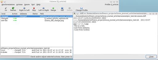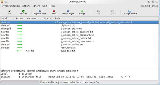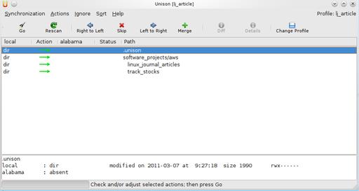 So, what happens if a file has been changed on both roots since the last sync? The default action is to skip syncing that particular file, and this is represented by a ? in the file listing (Figure 6). It is left up to the user to decide what to do in that situation. That said, preferences can be set to force Unison's hand (search for “force” in the manual). Should you decide to sync, some tools are available to help you make a decision on what to do with a file. For nonbinary files, you can use the Diff button to look at the diff between a pair of files to help figure things out. There also is the Merge button. This requires some extensive preparation, and I have not used it since I first tried Unison many years ago (at the time there were known issues with the merge code). Since then, considerable work has gone into making merge functional, and it is on my to-do list to give the new code a spin. The manual provides detailed instructions for setting up merge, if you are so inclined.