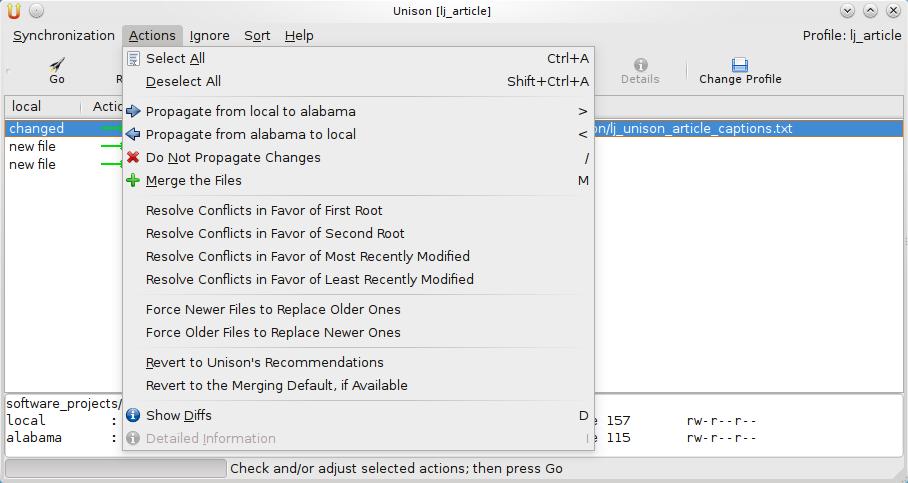 For batch actions on the files, use the Actions menu (Figure 5). Also worth mentioning is the Ignore menu item. It is very handy in that it will write an ignore preference to your profile matching the item you select using the ignore type you select. With version 2.40.1+, a profile editor is built in to the GUI interface. So, if you decide you want to undo the ignore preference, simply go to the Synchronization menu and then Change Profile.
