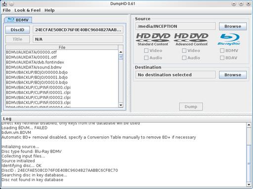 While I must stress from the outset that I couldn't get this to rip my only disc, it looks to be invaluable nonetheless. Also developed by the Doom9 folks, like libbluray and libaacs, DumpHD is a sleek GUI program for decrypting HD-DVD and Blu-ray discs and dumping the files onto your hard disk. According to the documentation: “DumpHD is a HD-DVD/Blu-ray decrypter based on the idea of BackupHDDVD by muslix64. The goal of this program is to make a perfect backup without any traces of AACS.”