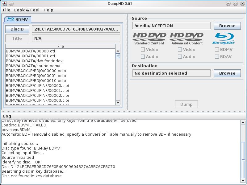 Although I don't have space to cover the installation properly, I did find this program in the Ubuntu repository, and as this is a trickier program, I hope it'll be in your distro archive too. Using DumpHD at least is easy. The only real input required from the user is to browse for the disc's path (/media/INCEPTION, in my case), as well as to browse for a destination. From here, you need to check only whether you want audio, video or both, and then click Dump.