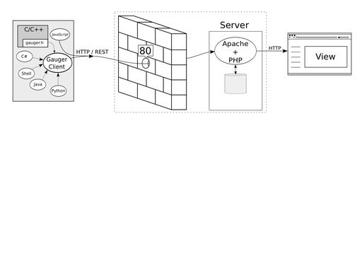 All of the performance-monitoring machines to be used with Gauger should install the Gauger client, and the software to be tested should be integrated with the appropriate language bindings. Language bindings are designed to be transparent and (except for a few extra system calls) have no negative effects in case the Gauger client is not installed on the machine. Thus, it is safe to commit the language bindings to a project repository. As long as the (tiny) language bindings are included, integrating Gauger will not disrupt operations on systems where the Gauger client is not installed.