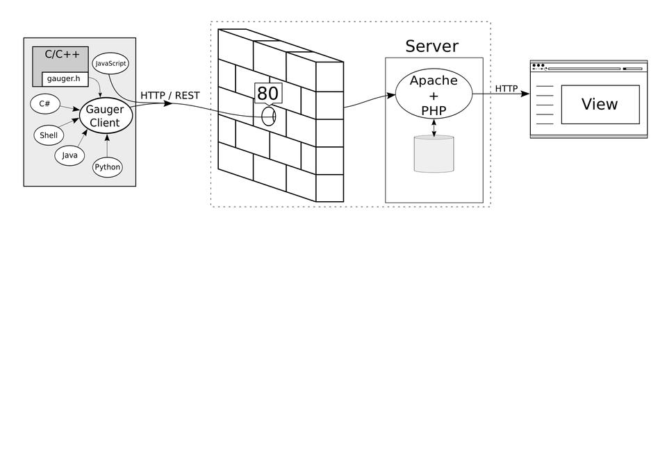 The Gauger server runs the data collection and visualization part. Data is logged through a RESTful API and saved in human-readable plain-text files. The primary job of the server is to provide a dynamic Web interface to visualize and analyze the collected data. All the communication between Gauger clients and the Gauger server is done in standard HTTP(S) requests so that only port 80 (or 443) needs to be open (Figure 2).