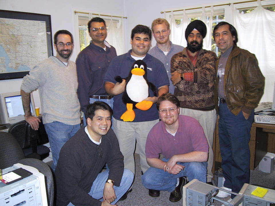 Linux installfest at 419 N Vista St., Los Angeles (circa 2001). Left to right, top row: Danny Olster, Abhijeet Chavan, Christian Peralta Madera, Mike Steins, Charanjeet Singh, Christian's Dad. Bottom row: Chun Wong, Chris Steins.