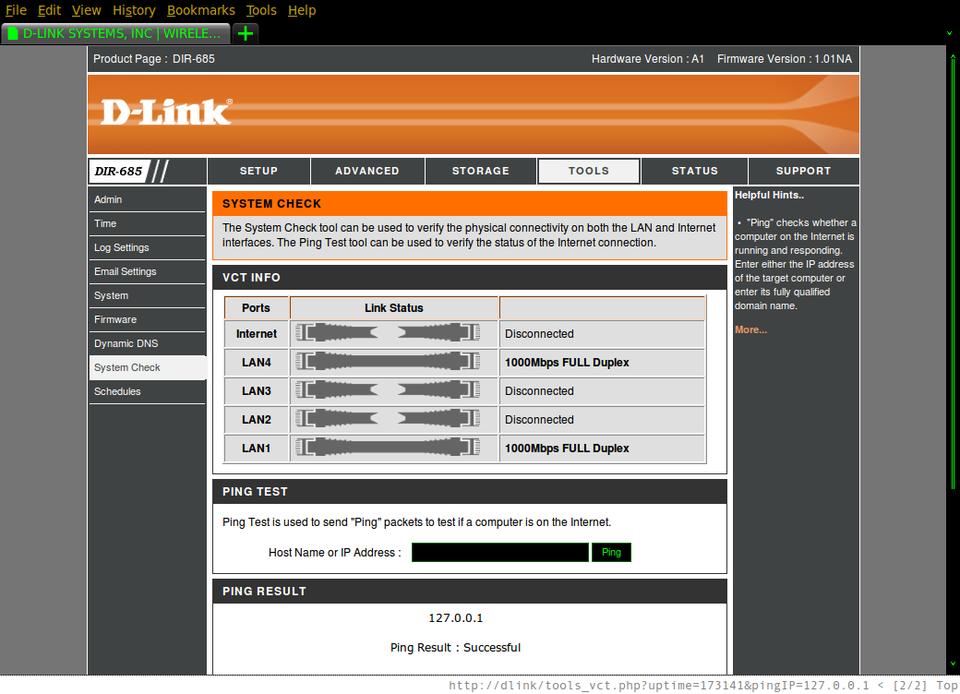 As I continued searching though, I got my first clue: the ping test. The Web interface provides a complete set of diagnostic tools that, among other things, allows you to ping remote machines to test for connectivity on http://<router ip>/tools_vct.php (Figure 1). I figured there was a good chance that the PHP script just forwarded the hostname or IP address you typed in to a system call that ran ping, so I started by adding a semicolon and an ls command to my input. Unfortunately, there was a JavaScript routine that sanitized the input, but what I noticed was that after I submitted a valid input, the variable also showed up in the URL: http://<router ip>/tools_vct.php?uptime=175036&pingIP=127.0.0.1.