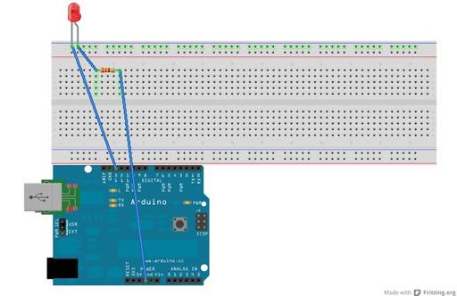 For the first sketch, let's blink an LED and then extend it to blink multiple LEDs alternately. Before the software part, let's first set up the circuit to connect the LED to the Arduino. The completed circuit should look like Figure 2.