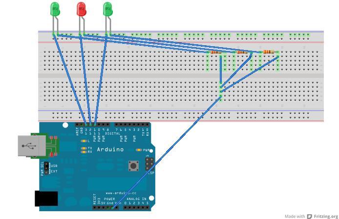 For the next sketch, let's connect multiple LEDs and blink them alternately to create a cool rippling effect. (You might want to connect more than three LEDs of different colors.) The circuit for this sketch is shown in Figure 3.