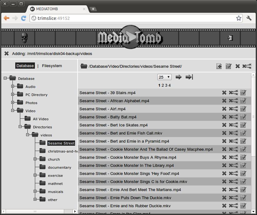 Once restarted, connect to http://trimslice:49152/. Enter the user name and password, and you will be in the GUI. To add a folder, click the Filesystem link, and browse to the folder you want MediaTomb to index. With the correct folder selected in the left pane, click on the plus, or plus-with-a-circle icon, to have MediaTomb scan the contents of the folder. The plus-with-a-circle icon adds the folder as an autoscan folder, meaning it will rescan the folder periodically looking for new files.