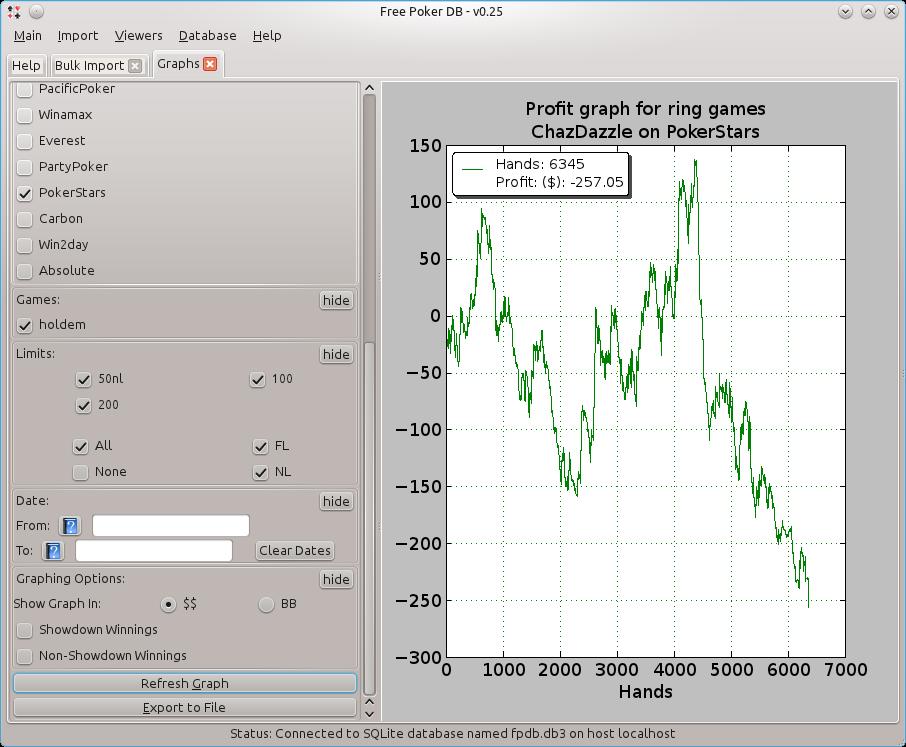 The best supported commercial site for Linux is PokerStars, as it runs almost perfectly under Wine. As a religious guy, I can't actually play for money, but I can vouch for PokerStars as it does have a “Play Money” mode for people like me. However, the developers did make it clear to me that fpdb is focused on real money games, so play money support isn't well tested but should work for PokerStars' cash games.