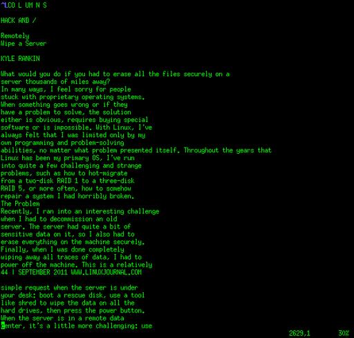 There is a bit of a problem, you'll find, if you do read Linux Journal in text-only mode: there's no pictures! Although some articles still are educational in pure text, with others, it really helps to see a diagram, screenshot or some other graphical representation of what the writer is saying. You aren't without options, but this next choice is a bit of a hack. Because there are versions of the w3m command-line Web browser that can display images in a terminal (the w3m-img package on a Debian-based system provides it), what you can do is convert the PDF to HTML and then view the HTML with w3m. To do this, you use the pdftohtml program that came with the same package that provided pdftotext. This program creates a lot of files, so I recommend creating a new directory for your issue and cd-ing to it before you run the command. Here's an example of the steps to convert the September 2011 issue: