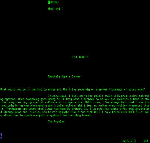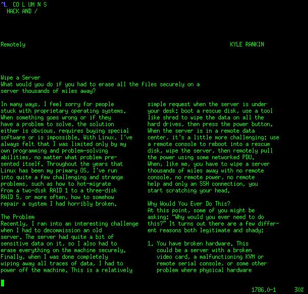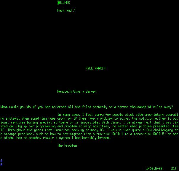 In this day and age, there are more ways to read than ever before. Even though Linux Journal no longer publishes on paper, you still can read it with Web browsers, PDF software, e-book readers and cell phones. I don't have an e-book reader myself, but I think you could make the argument that the one true way to read Linux Journal is from the command line. After all, I read my e-mail, chat, check Twitter, do most of my day job and write my articles from the command line (okay, it's true I use gvim too; it frees up a terminal window), so why not read Linux Journal from the place where I spend most of my time?