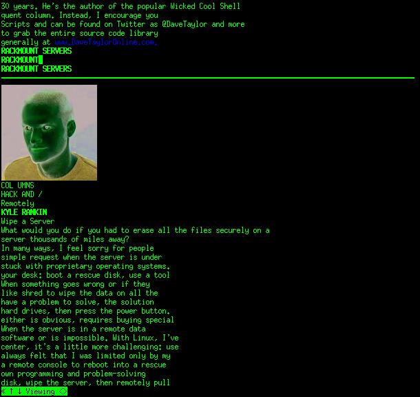 Once the command completes, you can run the w3m command against the lj-2011-09.html file, and if you have the special version that loads images, you will start to see the images load in the terminal. Now, by default, this output is much like the original output of pdftotext. There is no attempt to preserve formatting, so the output can be a bit of a mess to read. Also, as you can see in Figure 3, my headshot looks like a photo negative.