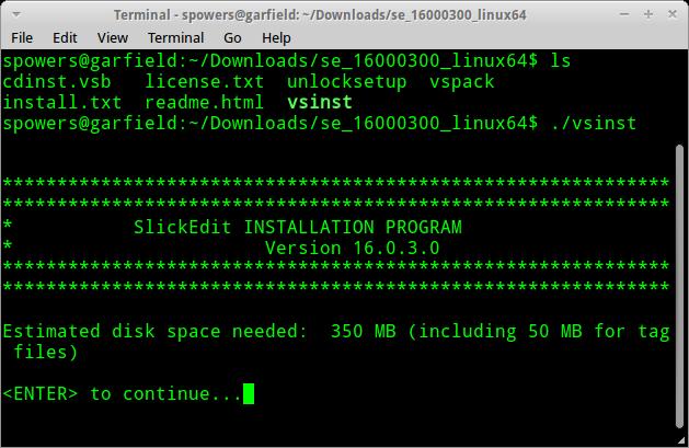 Installation is fairly straightforward if you've ever installed a closed-source application in Linux. Both 32- and 64-bit versions are available, and on the handful of systems on which I installed it, I didn't run into any problems with dependencies. The installation must be performed on the command line, as there is interaction during the install (Figure 1). By default, the program is installed into the /opt/slickedit directory. (Thanks to the SlickEdit folks for not using weird capitalization in the installation directory; that is so frustrating.)