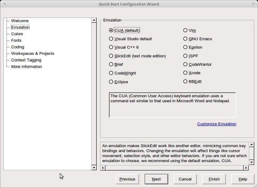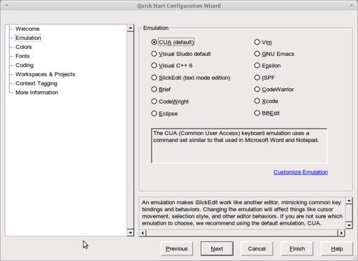 During the Quick Start Wizard, you start to see some of SlickEdit's neat features. Figure 2 shows the configuration screen for selecting keyboard emulation. If you're used to a particular set of keybindings (like vim in my case), SlickEdit can use those familiar keybindings by default. You even can customize the emulation if your needs don't line up with the dozen-plus emulation options offered.