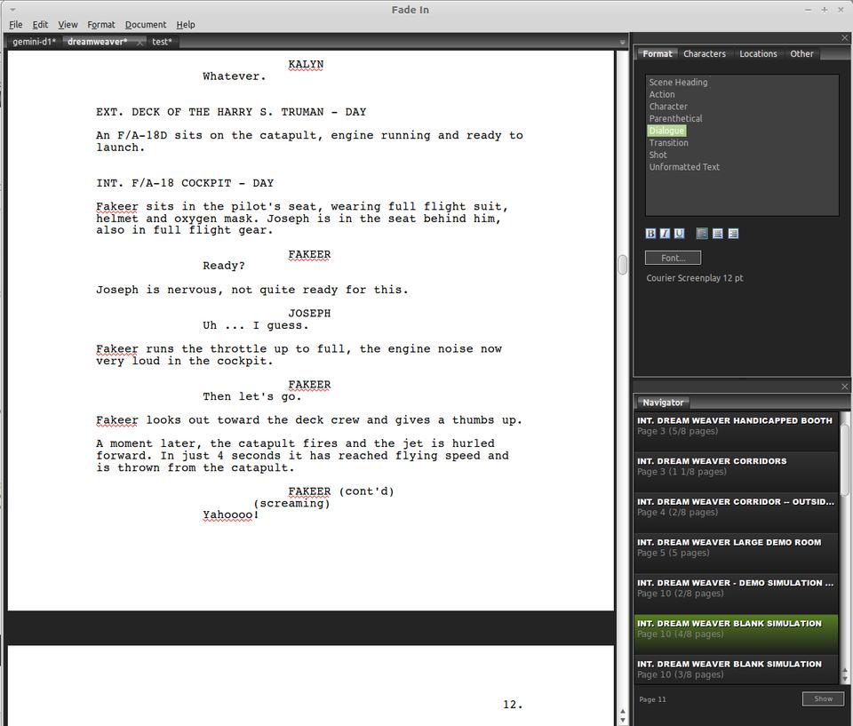 At first, I was able to get by with Celtx, a free screenplay program that is available for Windows, Mac and Linux. But a nasty bug crept into the Linux version, making it painful to enter character names for dialogue. Although the developer acknowledged the issue two years ago, and several new versions have been released since then, the bug is still there.