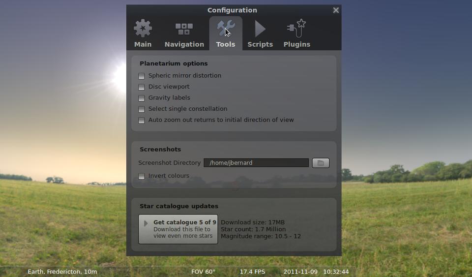 To access and run scripts in Stellarium, you need to open the configuration window and click on the scripts tab. Once you've written your own scripts and want to run them, you can place them in the scripts subdirectory of the user data directory. On Linux machines, the user data directory is $HOME/.stellarium. Once you put your script files there, along with any textures they may require, they will show up within the list of scripts in the configuration window. A plugin architecture also is available, but it is much harder to use, and the API varies from version to version.