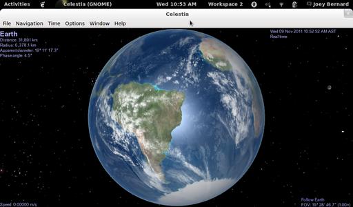 In 2007, Vincent Giangiulio created an add-on called Lua Edu Tools. This add-on provides all kinds of extra functionality to Celestia. A toolkit is displayed on the right side of the screen that provides sliders for controlling many of Celestia's parameters. It also provides a “cockpit” overlay, making it feel even more like you're flying through space. The default texture is the space shuttle, but you can use other ones too. Celestia also lets you use a joystick to control movement, so you can immerse yourself completely into your dream of flying through space.