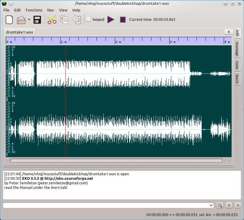 EKO is a simple sound editor. EKO understands all popular sound formats (except MP3) and is useful in simple editing (cut/copy/paste) with minimal FX processing. External FX currently are not supported.