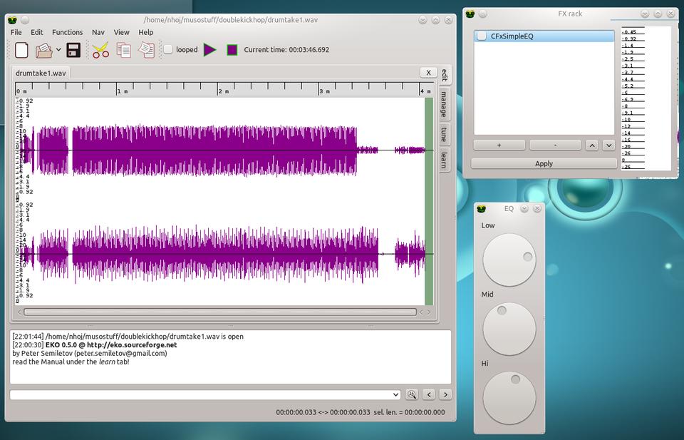 Although the FX rack was quite limited at the time of this writing (only four effects in total: amplification, EQ, overdrive and pitch shifting), author Peter Semiletov has chosen wisely in implementing perhaps the most useful features before expanding EKO's capabilities. While using Jack with effects generally involves some complicated routing, EKO's use of its current effects already has the routing done for you.