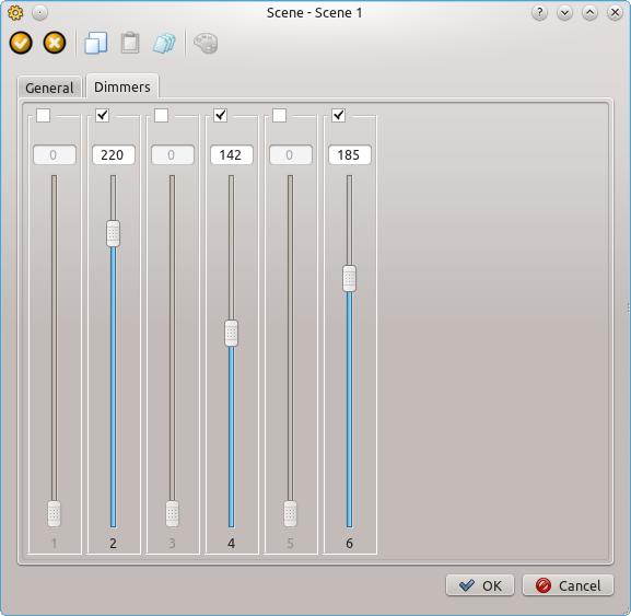 Click on the Functions tab, and in the Functions toolbar, you'll see a series of new icons. Click the button on the left, New scene, and a new window appears. Click the + button and choose the fixture to be used (likely just one if it's your first time). Back in the scene window, you probably should enter a name in the given field before proceeding further. But, to do something interesting, click on the second tab, which will be named after the fixture type (“Dimmers” in my case).