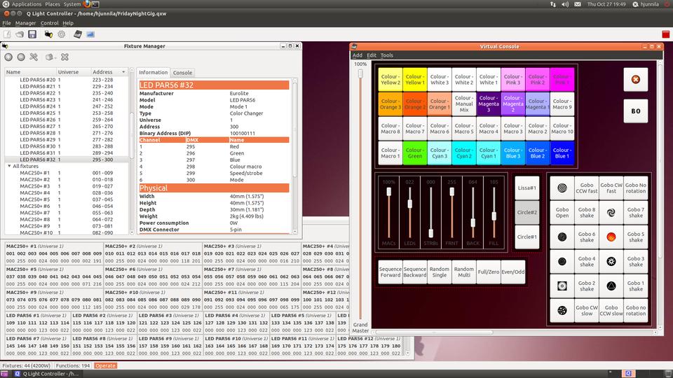 Q Light Controller is a cross-platform application for controlling DMX or analog lighting systems like moving heads, dimmers, scanners and so on. The goal is to replace hard-to-learn and somewhat limited commercial lighting desks with FLOSS.