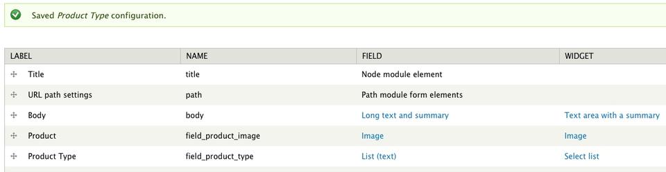 Completion of the above will take you back to the table of fields for Product. Now, let's add another field to indicate whether an item is a pen or a pencil. Call it “Product Type”, and set the Field Type to “List (text)”, leaving the Widget set to Select List, so that when content is entered later, you can select the product type from a list. This time after you save, you'll see a form containing a field called, “Allowed values list”. Enter in that field, on separate lines, “1|Pen” and “2|Pencil” (without the quotation marks). This is a key and value hash that will become the available choices for users. Now save your way out, accepting default settings. The field list should then look like the screenshot shown in Figure 2.