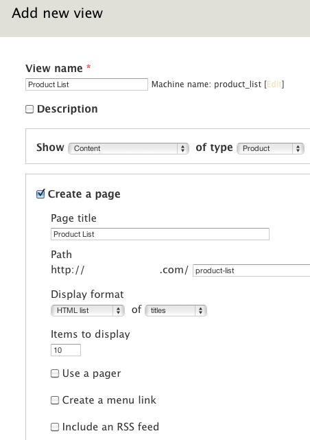 In the View Name field, enter “Product List”. In the section that begins with Show, you can select the kind of view to create. For our purposes, select “Content”. To the right of this, after the options update, you may select the content type to show. Choose “Product” from the list. If you hadn't noticed, this form is something of a wizard. Now change the sorting method to “Unsorted”.