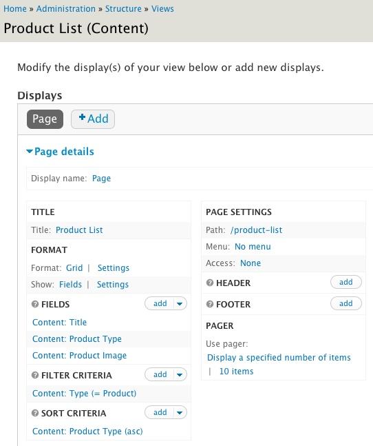 Each content entry that you create, you can access individually, as an on-the-fly page, which are referred to as nodes. However, let's also create a page that lists all of the products with links to these nodes. To do this, you need to create a view. A view allows you to aggregate and arrange content on a site, and to organize and group data based on field values and other factors.