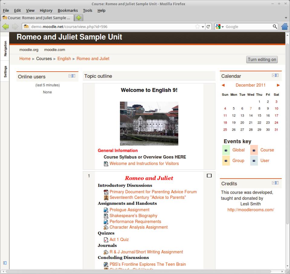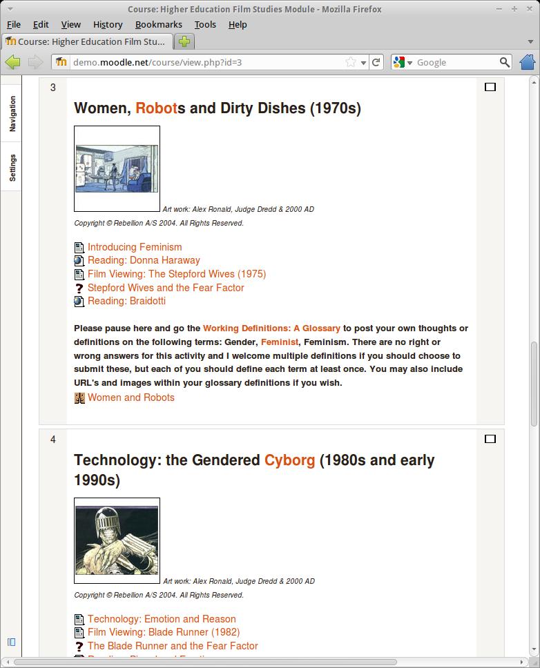 Figure 1 shows a demonstration course set up in Moodle. Instructors can set up their “classrooms” in a variety of ways. In the Romeo and Juliet example, the instructor has given a basic outline of the class with appropriate links for downloading assignments, taking on-line quizzes and on-line journaling. Figure 2 shows a demo course on Film Studies. In this example, the instructor has broken up the class into sections (apparently, each section represents a class session). Classes can be broken up in several ways—flexibility is one of Moodle's strengths. Every instructor doesn't have to use it the same way.