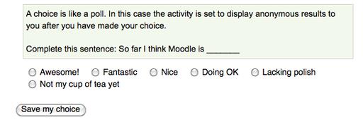 Surveys and polls: Moodle offers instructors the opportunity to ask their students survey questions from within the course. These surveys could be used as an assessment for the teacher, as a way to gauge the level of understanding on an upcoming assignment, or to get feedback from students on any topic the teacher desires. They also can be set to anonymous so the students aren't identifiable, or they can be set to record user accounts with responses (Figure 5).