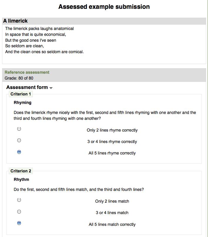 Workshops: assignments are set up as direct communication between students and instructors. With the workshop module, students can participate in peer reviews and assessments. Instructors can design specifically how students can respond to assignments in the workshop module, so although it is a peer assessment, the process still is guided by instructors. Figure 6 shows an example of a possible workshop, with some criterion for the users to assess.