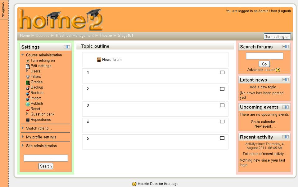 Site design: the classroom features mentioned above are the meat and potatoes of using Moodle. The Moodle course itself can be tweaked and modified as well, however, to make the site as useful as possible. The layout for the course page is designed using blocks. Anyone familiar with content management systems like Drupal or WordPress will understand the concept of blocks. Figure 7 shows the default layout of blocks in a newly created course. Blocks can be added, deleted and moved around. The function of available blocks varies from calendars to quiz results, and it includes the ability to embed Flickr photos or YouTube videos right into the Moodle page.