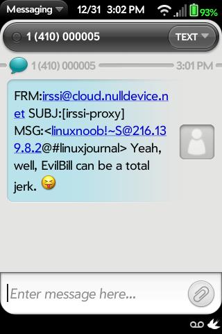 “But Bill...e-mail isn't an SMS!” You may think that, but just about every mobile carrier can accept SMS messages for delivery to a mobile phone via e-mail. In my case, I use AT&T, so any e-mail sent to <myphonenumber>@txt.att.net will arrive as a text message on my phone. So, all I have to do is drop Michael's scripts in my Irssi scripts folder, adjust awayproxy.pl so that the $config{emailto} variable is mymobilenumber@txt.att.net, and then activate both scripts from within Irssi by doing a /script load awayproxy.pl and /script load screen-away.pl. Now, any mention of my name in any of the channels I sit in will cause an SMS to be fired off to my phone, and I can log in from my phone or tablet and jump into the conversation.