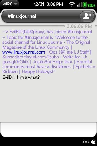 Figure 2. Jumping into the Conversation—Using wIRC on WebOS
