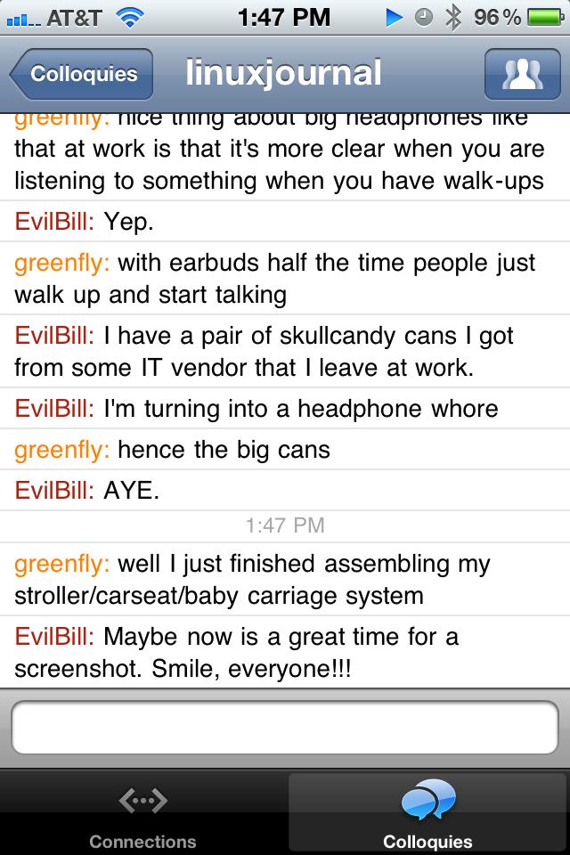 The other major flaw with this scheme is that it doesn't work well with mobile devices like tablets and mobile phones. Yes, I could SSH from my iPhone to my Linux server and attach to that Screen session with Irssi running in it, but a terminal emulator on a 3.5" screen, where a good portion of the screen is taken up with an on-screen keyboard, is a recipe for a headache. There are excellent IRC clients for mobile phones, like Colloquy on the iPhone, Yaaic for Android and wIRC for WebOS, but if you run them while you have a Screen session going, you're back to the same problem mentioned above where you wind up with a “WildBill|Phone” login. There simply had to be a better way.