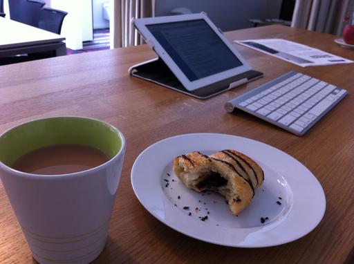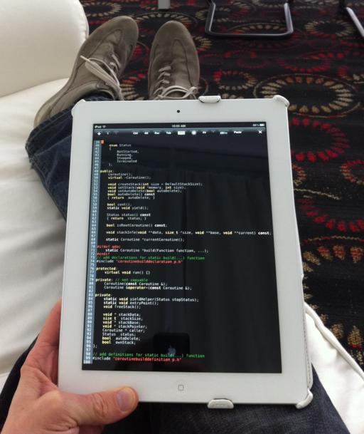 I typically start my day by catching up on the bug-tracker chatter, mercurial diffs and other e-mails with the iPad in one hand while lying on the Combinat56 sofa.