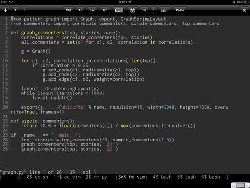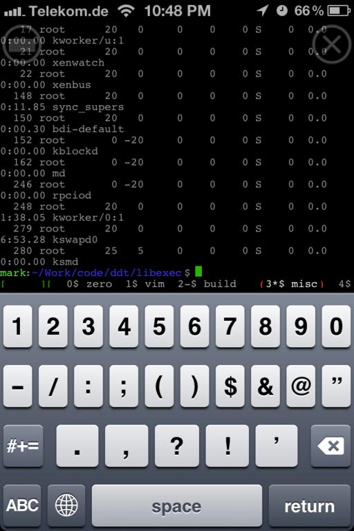 During the Skype call, my iSSH session timed out in the background. It's only held for ten minutes or so. Fortunately, a single tap reconnects me, and through the magic of GNU Screen, I'm back at exactly the place I left off again.