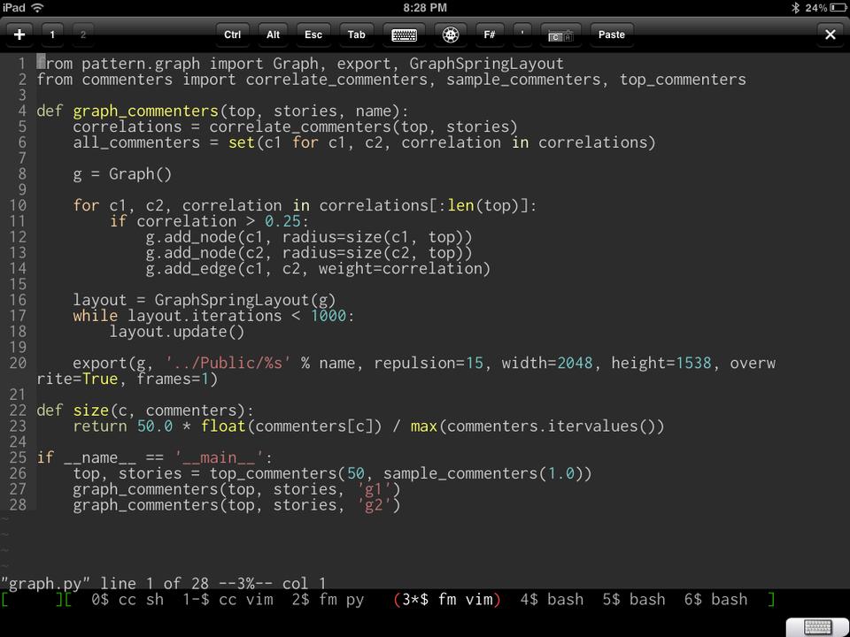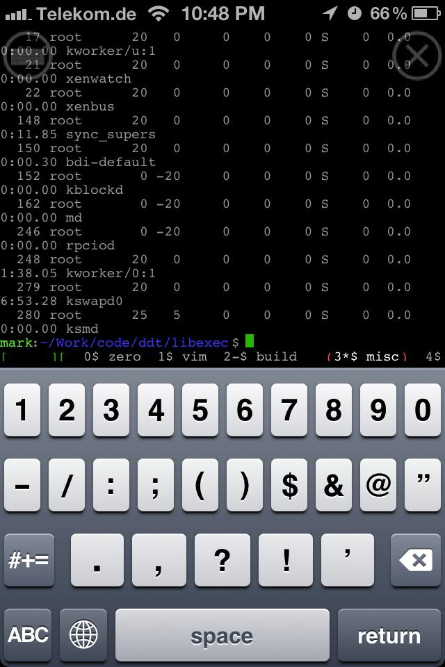 So, I fire up iSSH, tap on my Linode connection and reconnect to the already-running Screen session. All my terminal tabs are exactly where I left them. Other SSH tunnels still are set up. My cursor still is in the same position. The clipboard is as I left it. It's as if I never left, because for my side projects, I have a different Screen session with a different set of tabs and editor instances running—perfect separation.