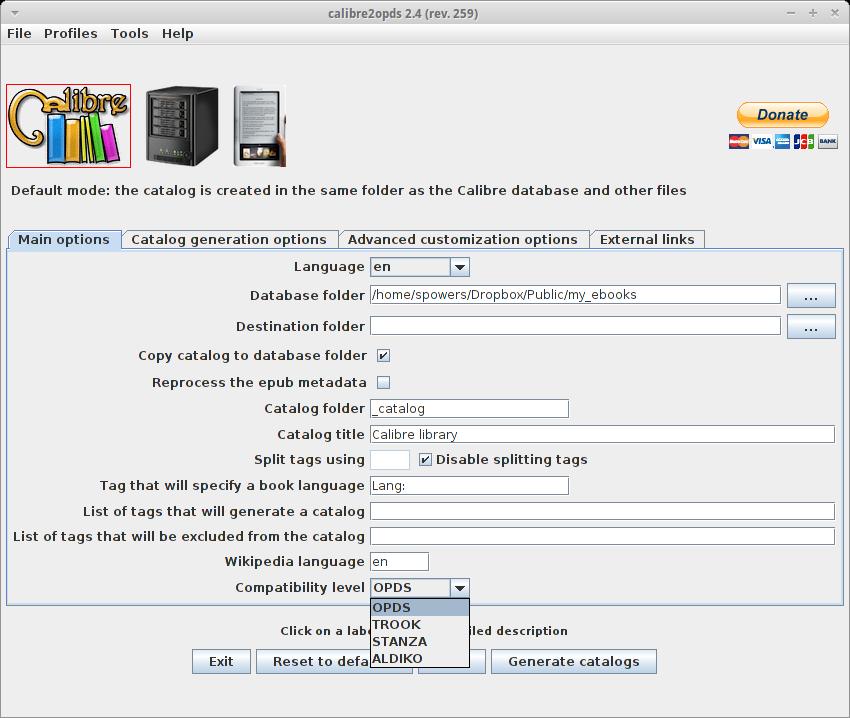 Next, you need to decide what sort of Web site you want to create. If you want to be able to browse it with any Web browser, leave the “Compatibility Level” at “OPDS”. If you want to browse directly with your Android device, you can choose either TROOK or ALDIKO, and calibre2opds will generate a catalog that those readers can access directly. Once you tweak any other settings to your liking, click the Generate Catalogs button on the bottom, and it will create all the files you need right inside your Calibre database folder.