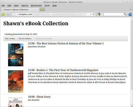 Because you did all this inside your Public Dropbox folder, you can look for that _catalog folder and find the index.html file inside it. Right-click on index.html, get the Dropbox public link for it, and see the result. (Note: you may need to find the index.xml file if you're trying to browse with Aldiko or Trook.)